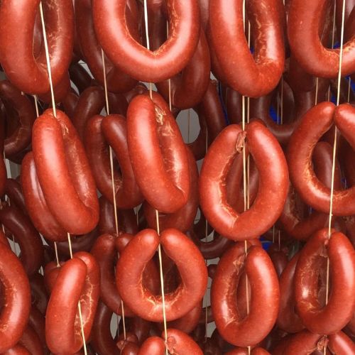 Sausage that has been aged and fermented in all seasons can be kept on the butchers’ counter for sale.
